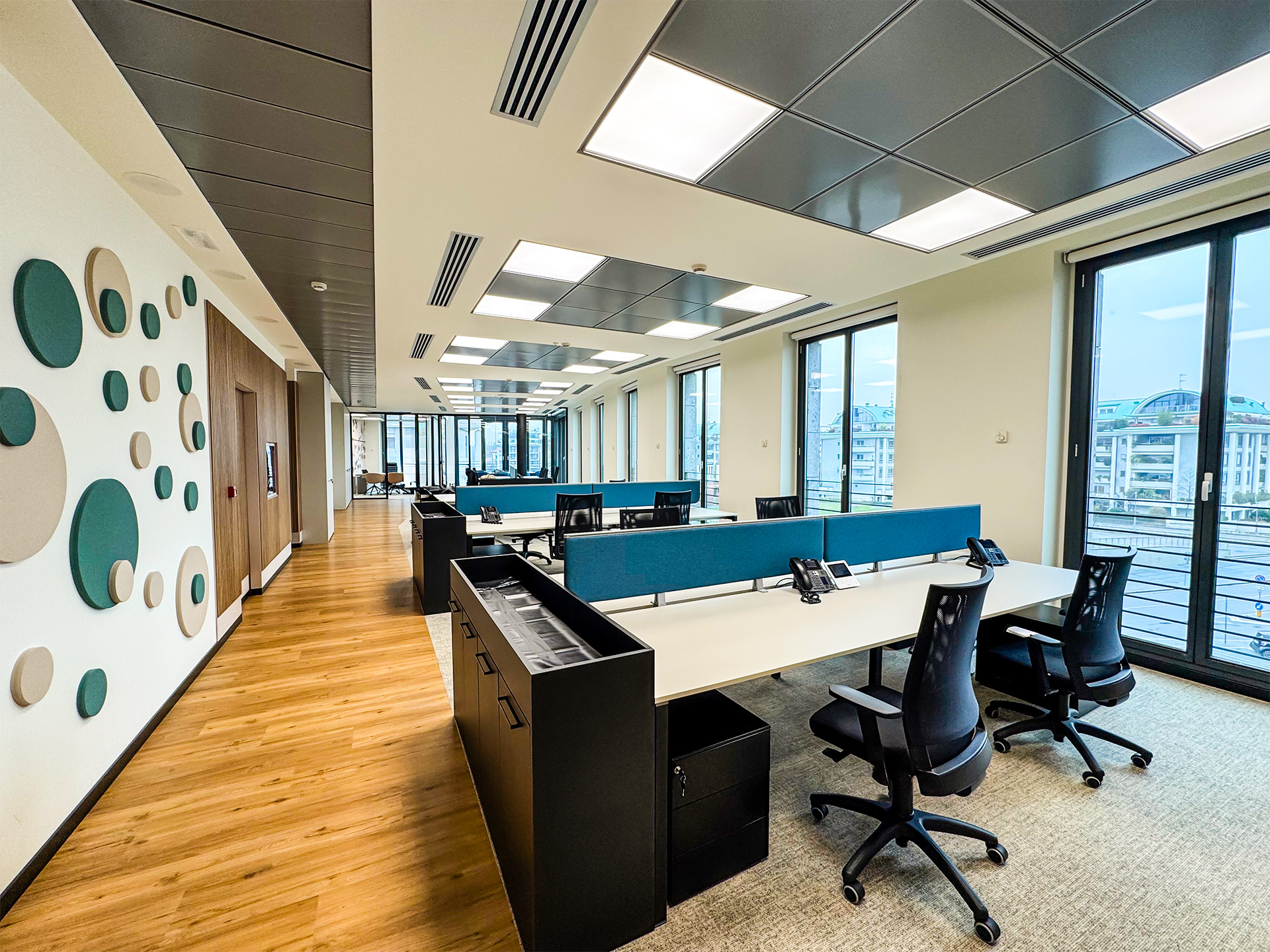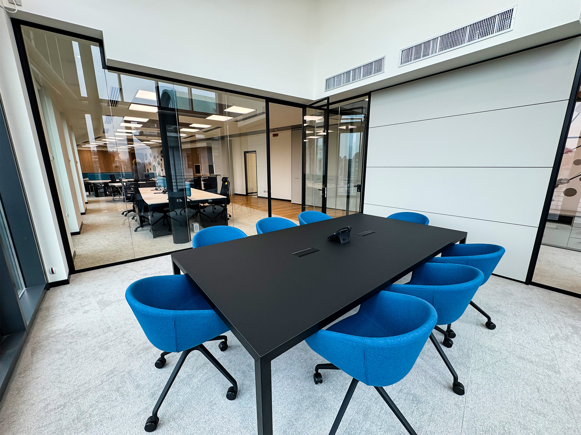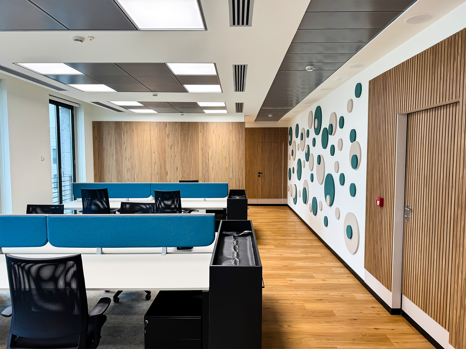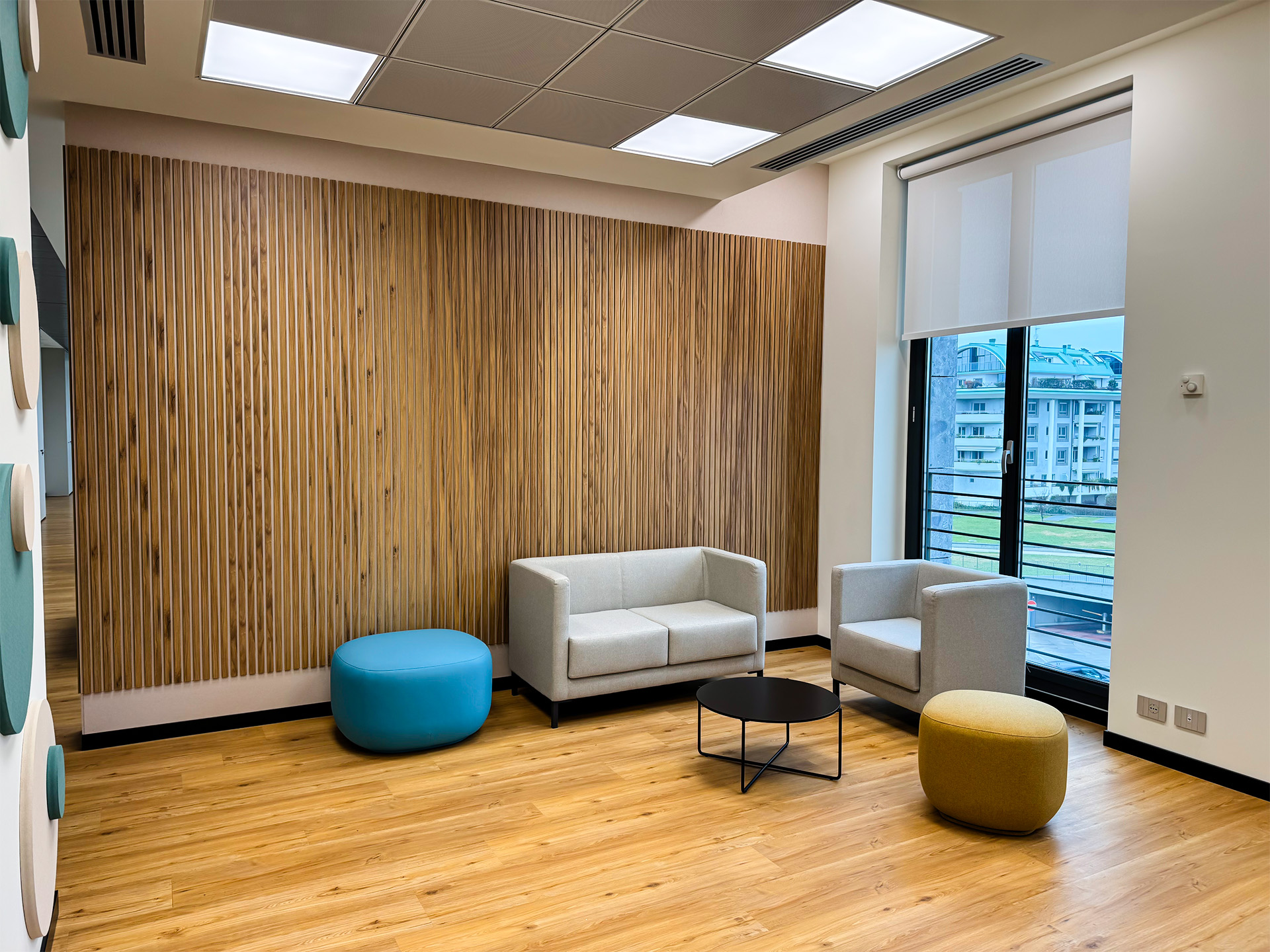 Arredoufficio ha sviluppato e gestito tutte le fasi del progetto e del cantiere: ristrutturazione, tinteggiatura, pavimentazione, pareti, rivestimenti e illuminotecnica. Grande attenzione è stata riservata al comfort acustico, con un allestimento di fonoassorbenza completamente custom che si integra perfettamente con gli spazi, migliorando benessere, concentrazione e privacy.